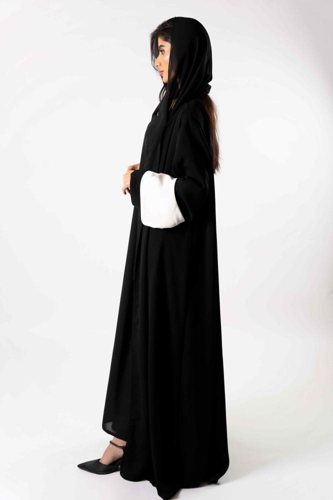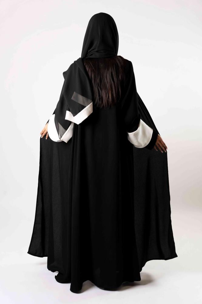 عباءة سوداء مع أكمام بيضاء ملفتة للنظر وتصميم فريد