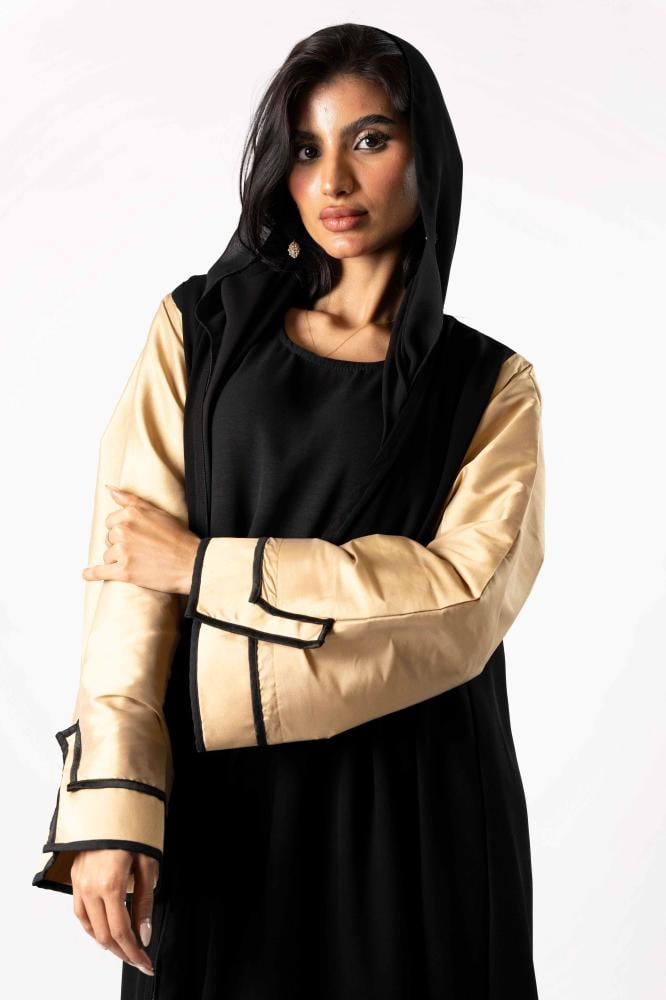 تتميز الأكمام بتصميم متداخل وراقٍ، مع حواف سوداء تضيف تباينًا جميلًا بين اللونين الأسود والبيج، مما يجعل العباءة خيارًا مميزًا لجميع المناسبات.