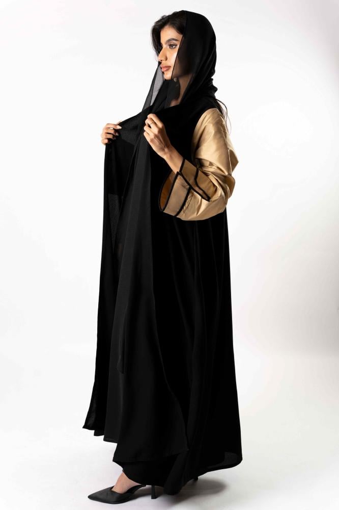 عبايه سودا قماش كريب اكمام بيج ذهبي تفته